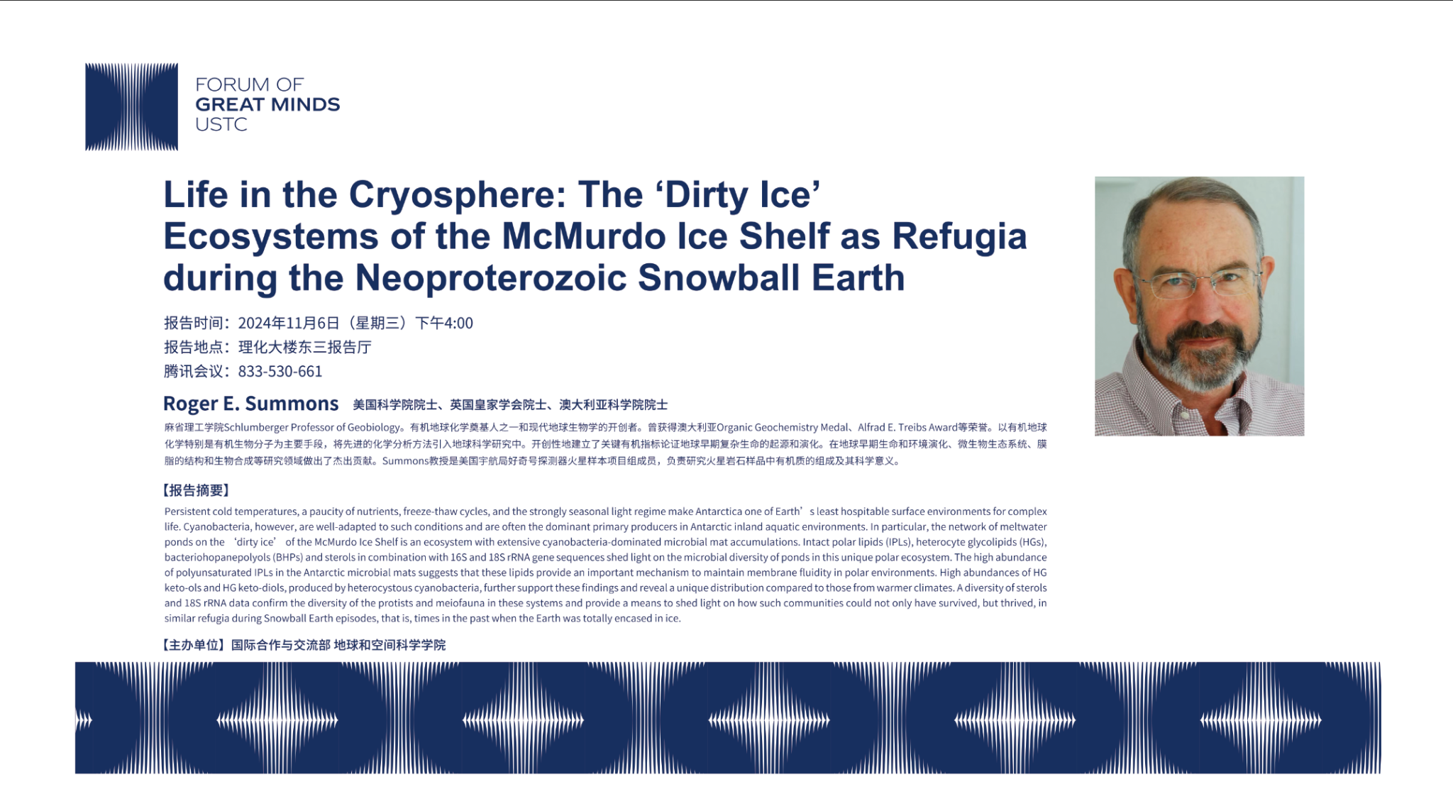 应学校邀请,美国科学院院士Roger E. Summons教授将于2024年11月6日来校作“Life in the Cryosphere: The ‘Dirty Ice’ Ecosystems of the McMurdo Ice Shelf as Refugia during the Neoproterozoic Snowball Earth”学术报告。