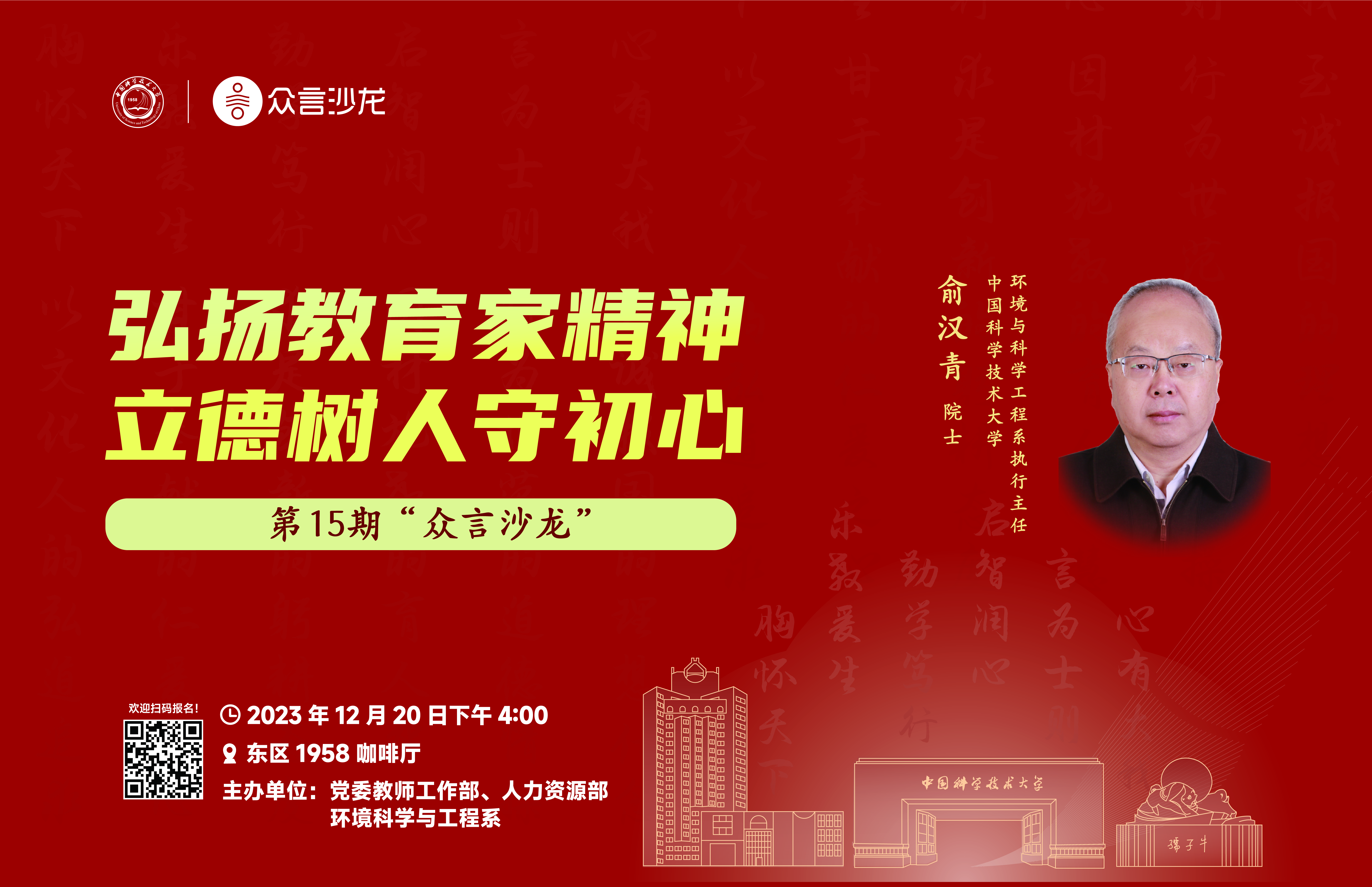 202399日,习近平总书记致信全国优秀教师代表,深刻阐述教育家精神内涵,并勉励广大教师以教育家为榜样,大力弘扬教育家精神,牢记为党育人、为国育才的初心使命。长期以来,学校深入贯彻落实习近平总书记的重要指示批示精神,将教育家精神落实落细到教师队伍建设的具体工作中,坚持讲好教育家育人故事。第15期众言沙龙将以弘扬教育家精神 立德树人守初心为主题, 邀请中国工程院院士俞汉青教授作为嘉宾,与大家面对面交流。