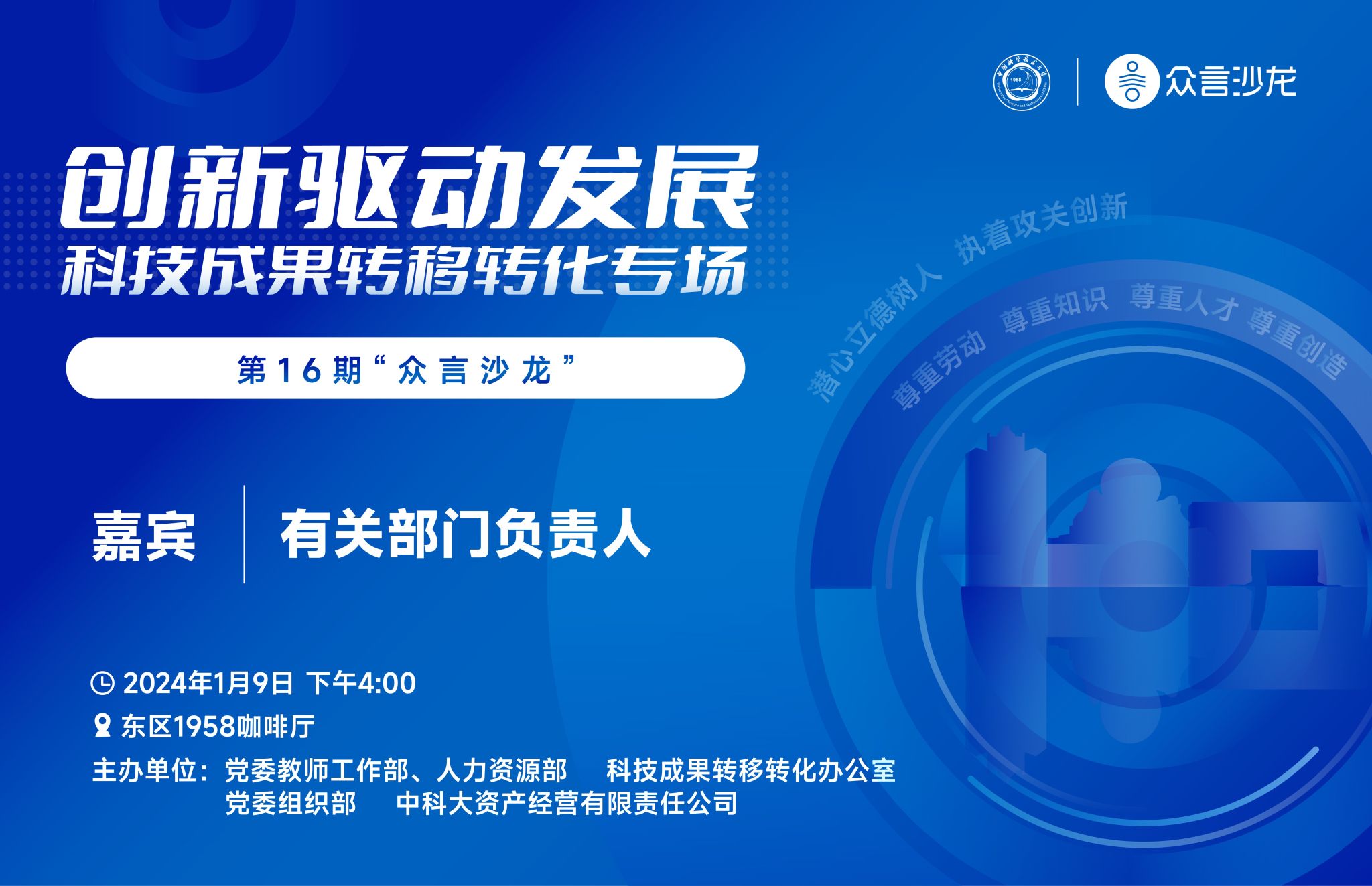 为贯彻落实党的二十大精神,加快实施创新驱动发展战略、人才强国战略,学校将以“创新驱动发展——科技成果转移转化专场”为主题,组织第16期“众言沙龙”活动。活动将邀请有关部门负责人,就科技成果转移转化及兼职管理政策与大家面对面交流。