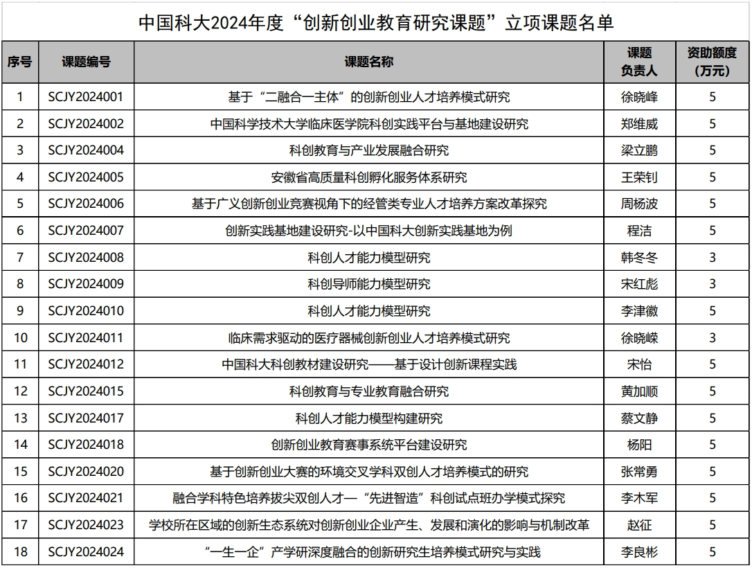 中国科大2024年度“创新创业教育研究课题”立项通知