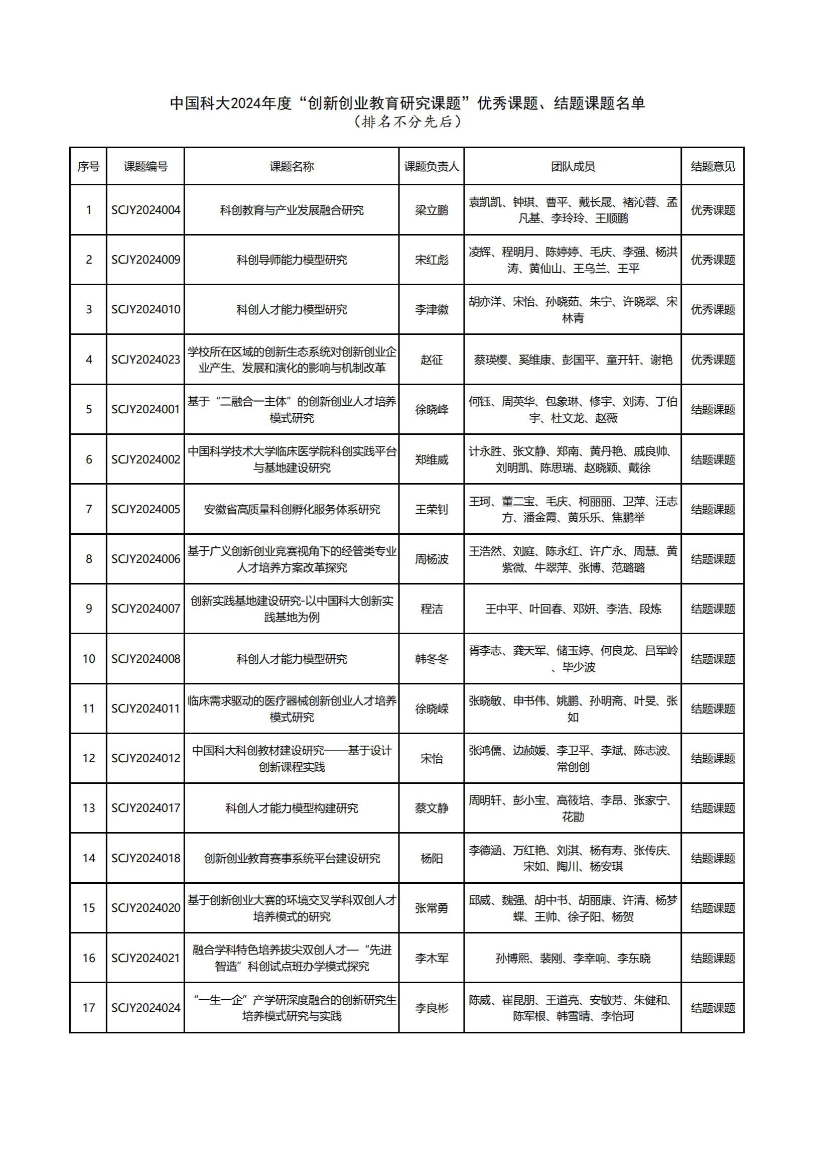 关于公布中国科大2024年度“创新创业教育研究课题”结题课题的通知